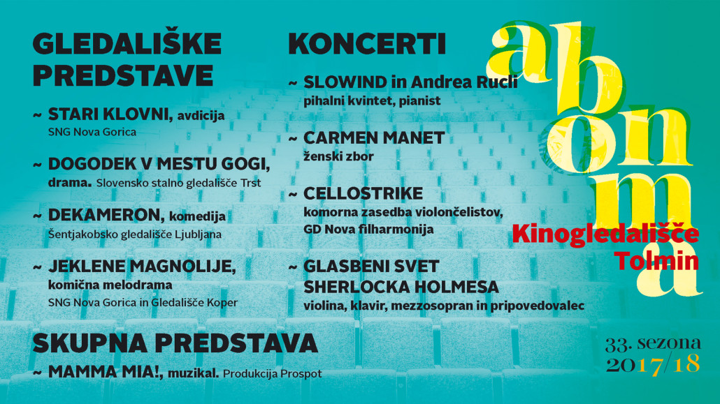 S sredo, 20. 9. 2017 se pričenja letošnji vpis v abonma, ki v 33. abonmajski sezoni prinaša 4 GLEDALIŠKE PREDSTAVE in 4 KONCAbonma plakat 2017_1ERTE ter veliki SKUPNI MUZIKAL.