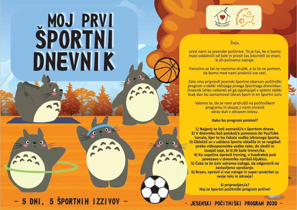 Vsak počitniški dan bo zaznamoval izbran šport in en športni izziv. Vsi otroci, ki se nam bodo pridružili ter nam po opravljenem 5-dnevnem izzivu na elektronski naslov poslali izpolnjene dnevnike, bodo prejeli lepo praktično nagrado. Rok za oddajo dnevnikov je: 6. 11. 2020, na elektronski naslov: malahisa.tolmin@gmail.com.